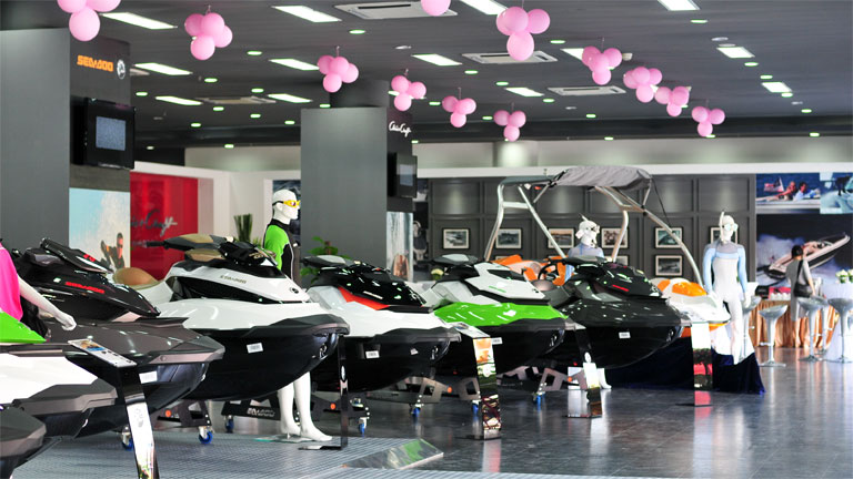 目前庞巴迪展厅与克里斯展厅完全打通,聚合超过1000平方米的展示面积。整个展厅产品排布错落有致,产品类别包含摩托艇、快艇、全地形车以及水上运动周边产品。展厅还设有休息区、洽谈区,并配之以高端的内饰应用和灯光设计,凸显出庞巴迪和克里斯品牌高雅而不凡的品牌品位。
