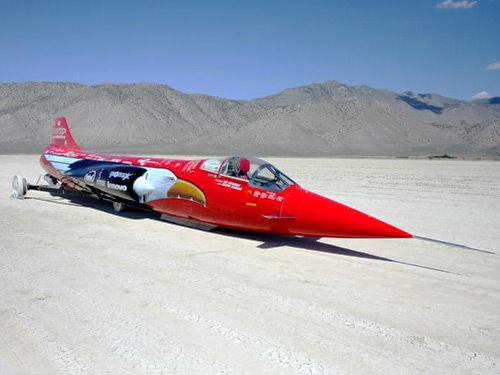 图:把自己“绑”在特制的座位上,安迪 格林准备开着自己的“座骑”一展风尘,前方,煎饼状的沙漠绵延展开,电脑显示所有系统正常。格林解开刹车,踩下油门,喷气式发动机开始轰鸣。42.5秒之内,格林的车就能加速到1000英里每小时。