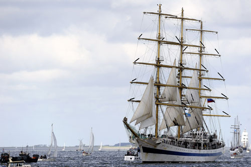 俄罗斯海军“和平”号风帆训练舰于1987年在波兰格但斯克建成,共同六艘同型舰,“和平”号为第三艘。该舰为全帆装型,长109.2米,宽13.9米,高52米,吃水6.3米,满载排水量为2771吨。该舰为风帆和柴油机混合动力,据称最高航速高达19节(风帆状态),曾被称为世界上最快的风帆军舰。该舰舰员在70-144人之间,最大载员199人。该舰母港为彼得堡,该舰一直为俄罗斯海军执行学员训练任务,经常访问包括英国、美国在内的西方国家。