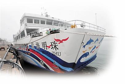 ![]() 今天如果海上天气条件许可,市民可在奥帆中心至栈桥一带的近岸海域上看到青岛海上旅游有史以来最大的游船。记者昨日获悉,青岛轮渡公司所属渡轮向海上游船变身的第一艘、排水量2330吨的“鲁胶渡10号”渡轮,华丽转身改成游船“蓝海明珠”后,计划今天完成首次客运航线试航。昨日下午,在奥帆中心内码头,记者走近静候试航的“蓝海明珠”。 变身:客舱变豪华舞厅 即使经常乘坐轮渡的乘 在二层客舱,记者发现这里已经变成了一个多功能厅,厅内设有吧台和一个圆形舞池。多功能厅的四个角上都安装有42寸的液晶电视,中央位置搭设了一个舞台,并配备了音响以及点歌设备。在多功能厅的出口位置设有自助餐台以及吧台,可以提供各类休闲小吃和酒水。在原来客舱露天区域已经改造成带有罩棚的休闲观光平台,放置了轻便座椅和圆形小桌。 此外,游船上还有商会会议室和高档餐厅包间。