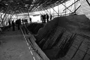 本报9月20日A12版《大雨冲出元代沉船》曾报道过菏泽一工地出现一艘古沉船。在对沉船进行了抢救性发掘后,昨日山东省文物考古研究所联同菏泽市政府、菏泽市文物考古研究所于菏泽市召开新闻发布会,这艘古船的年代最终被确定为元代,成为我省目前发现的年代最早的古代沉船。其中出土的一件元代青花龙纹梅瓶“身价”过亿。 元代青花瓷 元代随着国内外贸易的发展需要,中国瓷业较宋代有了更大的进步,景德镇窑成功地烧制出青花瓷器。 元青花瓷以景德镇为代表,其制作精美而传世极少,故而异常珍贵,根据时间大致分为延祐期、至正期和元末期三个阶段,其中又以“至正型”为最佳。元青花瓷开辟了由素瓷向彩瓷过渡的新时代,其富丽雄浑、画风豪放,绘画层次繁多,与中华民族传统的审美情趣大相径庭,是中国陶瓷史上的一朵奇葩,同时也使景德镇一跃成为中世纪世界制瓷业的中心。 元青花瓷器总体分两种色调,一种呈灰蓝色,较浅淡,一种是深蓝色,较艳丽。传统概念中,呈色灰蓝者为国产料,呈蓝艳者为进口料。进口青料用于大型、中型或小型元青花上,国产料仅用于中、小型器。 A 今年9月17日,在菏泽市一建筑工地上,工人们在作业时发现了一艘古船遗址。在警方和相关文物部门介入后,省文物考古所会同菏泽市文物管理处组成考古队对这艘古沉船进行发掘,并确定这是一艘沉没于元代的内河航运船。据了解,根据目前的发掘情况来看,由于保存环境不同,这艘古船的左侧木质基本腐朽,底部及右侧保存完好,可以复原。“由于此船保存基本完整,它为研究元代木船形制及制作工艺提供了实实在在的标本,并对菏泽古代漕运史、河运交通和蒙元时期黄河泛滥区之地形地貌研究均有重要意义。” “当时最先露出来的是船尾部的两个舱。目前测量后基本确定该船的残体长21米,宽4.82米,高1.8米。”据省考古所副所长王守功说,除去船头、船尾、独立舱外,共分为10个小船舱,大小不等,宽在1.3米和1.8米之间,初步断定船体木料主要是柏木和楸木。在他们介入发掘后,很快就从舱内发现并清理出来一些文物,“这些被发掘出来的文物对于研究元代上层社会文化生活和社会习俗等都具有很高的价值。” 此外,省文化厅副厅长、省文物局局长谢治秀也表示:“我们想将此次的考古发现申报今年的十大考古发现,如果成功,这不仅填补了菏泽在这方面的空白,还将让我省入选十大考古发现的项目数量达到16个。”而另据了解,这艘古沉船被确定为元代沉船后,也成为我省目前发现的古沉船中年代最早的一艘。 出土珍贵文物百余件 最值钱的“身价”超亿 据了解,在此次古沉船的发掘中,一直惊喜不断。“之前先是发掘出来一些零散的器物,包括一对儿金耳环。”王守功副所长告诉记者,但在对沉船的第九个舱室进行发掘时,一个让考古人员更加惊喜的文物慢慢“现身”。“当时小心翼翼地将一块泥土掀起后,发现里面居然有一个瓷瓶,但不知道是否完整,于是我们就暂停了发掘。”菏泽市考古所的一位参与发掘的工作人员说,之后在经过近一周的发掘,才出土了两件已经破碎了的青花瓷盘。“而与此同时,还出土了一件近乎完整的青花龙纹梅瓶,这让我们大喜不已。” 但为了考古的严谨性,当时并未对外公布这三件都是元代青花瓷器。“随后又经过对所有出土遗物的分析认定,以及沉船形状分析,我们基本认定这是元代官员或商人在内河行驶时所使用的船只。”最后直至本月22日晚上,经过众多专家和考古人员的鉴定后,才最终确定这三件确为元代青花瓷器。而同时出土的还有一批罕见的珍贵文物,其中包括陶器、漆器、玉石、玛瑙、金饰、木尺等,而这些文物中甚至囊括了景德镇、龙泉窑、钧窑、磁州窑、哥窑等五六个瓷系。“特别典型的是元代青花龙纹梅瓶、磁窑龙纹罐和钧窑影青釉杯盏,以及长约49厘米、对我国古代度量衡研究有重要意义的木尺。”除此之外,一对儿寿山石罗汉雕塑的出土,也让不少考古专家颇为吃惊,因为一般而言,寿山石都是到明代以后才开始流行,并形成一种流派,“而在这里发现,也给我们关于寿山石方面的研究增添了一些实物证据。” 一位不愿透露姓名的专家告诉记者,如果用价格来衡量这些出土文物的话,它们绝对价值连城,特别是后部船舱中出土的三件元青花。这三件元青花中,高约42厘米的青花龙纹梅瓶,不仅身价至少过亿,全国亦属罕见。“我和别人开玩笑,如果那个青花龙纹梅瓶定价2亿元,或者所有110件文物定价10亿元,我立刻就贷款提前买下来。” 为何元代青花瓷如此值钱?一位专家告诉记者,由于元代是青花瓷刚刚出现的年代,原本数量就很少,加上其艺术水平和观赏价值高,所以在几百年的流传后,这些瓷器的身价便不断上涨。“据不完全统计,全国元青花存世的数量只有两三百件,山东目前也只有十几件。而菏泽古沉船遗址中发现的这个近乎完整的元青花,绝对是珍品。” 老船匠探访古船 还原古沉船现场 “当时为了保护性发掘,我们特意请了鄄城县造船厂的两位老造船工人对沉船进行了考察。”省考古所一位考古人员告诉记者,这两名老造船工都已七八十岁了,但一见到这艘古沉船,直接就能说出每一个船舱的作用,而依着老船工的指引,考古人员也果真发现了相应舱位中有可能发现的文物。“老船工说位于尾部的那个舱位应该是