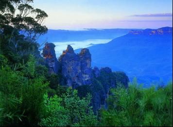 从悉尼往西驾驶一小时就可以抵达蓝山那由奇特的岩石层形成的三姐妹峰,它是澳大利亚旅游的标志性景点之一。沿悬崖边走入如巨形水槽般的贾米森山谷(JamisonValley),映入眼帘的就是保持完整的山峰,大自然的力量似乎并没有对它们造成伤害,而神奇的是围绕在它们周围的那些岩石却已经被逐渐的消蚀。三姊妹峰的名字来源于一个土著的古老传说,传说中有三个漂亮的姐妹违反了部落的规矩同时爱上了三兄弟,而部落巫婆为了保护她们,把三姐妹变成了石头。
