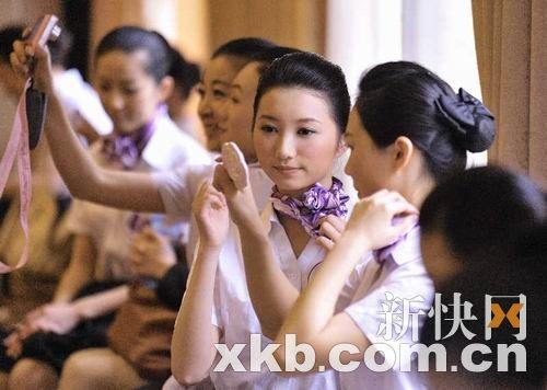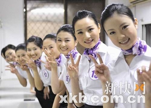 4月7日,由南方航空公司举办的第五届“空姐新人秀”电视晋级赛在武汉举行。从1万多名报名者中层层选拔出来的61名选手,将通过这次比赛的表现,最终获得空姐职位。其中的优秀选手还将参加“亚运空姐总决赛”,选出的精英将在亚运精品航班上为各个国家和地区的运动员、官员和来宾服务。