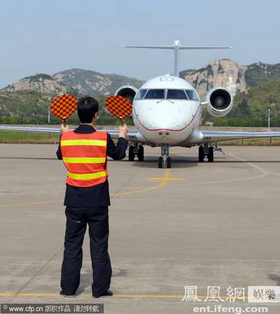 图注:飞机缓缓着陆 图注:引导员在引导飞机进入停机坪 图注:赵本山携小沈阳从“本山号”走下来
