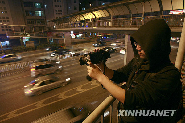 资料图:一名武汉市民手持DV拍摄路面交通情况。新华社发。