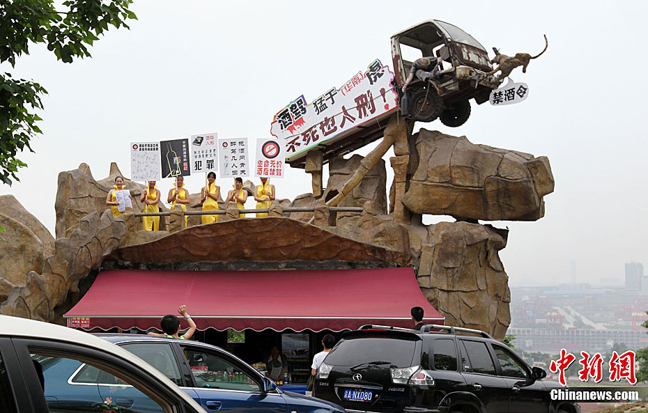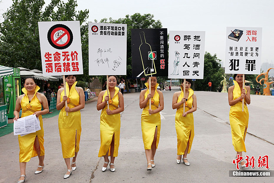 重庆“女子禁酒队”上街劝司机勿酒驾 5月12日,重庆洋人街成立一支“女子禁酒队”,专门劝诫司机不要酒驾。据悉,今后每逢周末、节假日,美女们都要举着“禁酒标语”上街发禁酒传单,并会让司机签名拒酒驾。图为“女子禁酒队”举着醒目的“禁酒标语”走在马路上。中新社发 刘函冉 摄