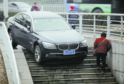 据了解,这辆车牌为“鄂AB9983”的宝马730,市场价在百万元上下。记者在现场看到,这辆车底盘被卡在台阶上,“趴”在下桥台阶上无法动弹。