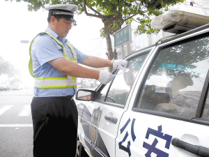 ![]() 杨东在给警车贴罚单
