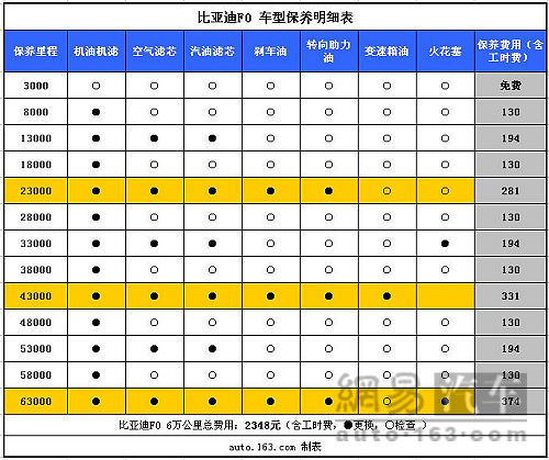 网易汽车报道 比亚迪FO炫酷的造型吸收并整合了众多国际流行元素。比亚迪F0秉承“风格JUSTCOOL时尚0缺憾”的设计理念,正面与丰田的AYGO颇有几分相似,大眼设计借鉴了奔驰SMART的灵感,尾部设计借鉴了雪铁龙C1的样式。比亚迪F0活力动感,非常惹人喜爱,成为很多年轻人第一辆车。究竟购买比亚迪F0和日后使用的费用是多少呢?下面我们就为大家进行分析。 一、购车成本,实用型4万余元开回家 购车费用常用公式:购车费用公式=裸车价(厂商指导价)+购置税+上牌费+商业保险+交强险+车船使用税 购置附加税:购车款/23.4(1.6升及以下);购车款/11.7(1.6升以上)1.6升以下排量的车型,购置税会得到减半的优惠政策。 验车上牌:此价格仅供参考,具体价格以各地验车上牌价格为准。 车船使用税:各省不统一,北京9座以下客车为480元/年,9座以上客车540元/年。 贷款买车的具体月供额,可到当地的4S店查询。 二、保养和维修价格属于中等水平,平均每年800余元 厂家给比亚迪F0提供的是3年10万公里的保修期限,相比于其他品牌的保修时限这一点值得肯定,令用户的需求得到了充分满足。车辆首保里程建议在3个月或3000公里做,首保免费。第二次保养是在车辆行驶8000公里或者半年的时候进行,第二次保养主要是进行更换机油机滤,并进行相关零件的检查以及油液的补充费用在130左右。车主以后每次保养的时间是在车辆每行驶5000公里后进行,每次保养的里程和保养项目的费用参见下表: 配件价格表: 比亚迪F0各个车型的保养费用相同,基本上6万公里内消费者在保养车辆上的花费为2635元。以上信息从北京地区的4S店获悉。其他地区的比亚迪4S店可能因为工时费用上的不同而造成保养价格上的差异。 三、油耗费用小车省油综合油耗5.2L/100km 根据国家工信部公布的《乘用车燃料消耗量》中比亚迪F0的综合工况油耗数据是:郊区4.91L/100km,城市6.19L/100km,综合5.2L/100km。区别于厂家公布的等速油耗,《乘用车燃料消耗量》是国家工信部以官方的形式客观对市场销售车型通过标准化实验所得来的数据,具有一定得权威性。但是,因为个人驾驶习惯和驾驶环境的问题,在实际使用过程中还会有出入。以北京地区93号汽油6.19元/升,一年行驶2万公里计算,可以得到燃油费为: 过路费、临时停车费等:以1200元计。上述各项使用成本相加1年2万公里使用成本约为12799元,平均每月为1066元,而且随着F0保有量的不断提高,保养费用将会不断的降低。 综合以上费用,比亚迪F0一年用车成本为:燃油费+车险+车船使用税+保养费+意外支出=6437.6+3900+480+782+1200=12799.6元。平均每月约1066元。 |