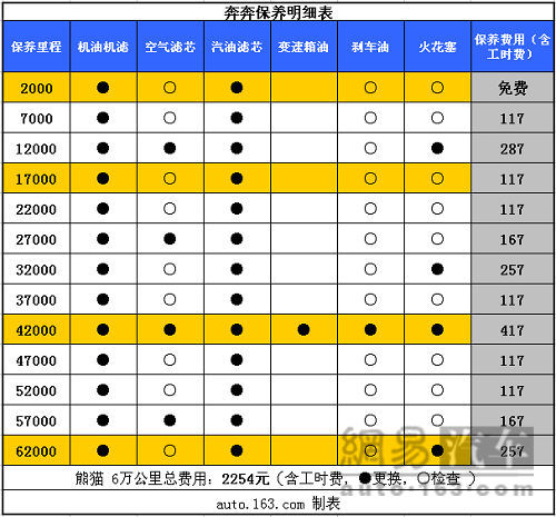 部分配件价格表: ![]() 三、油耗费用1.3手动版综合油耗7.4L/100km 奔奔的油耗在同级别中有点高,一个重要原因是自重较大,整备质量达到了1吨。奔奔的电子油门反映有些慢,车主往往在换挡后会深跟一脚油提速,这也是部分车主油耗高的一个原因。我们以一位网友三个多月行驶3500公里的油耗记录为例,计算出奔奔1.3手动挡的油耗为7.4L/100km。因为1.0L车型上市不久,可参考的数据不多,我们根据经验推测1.0L手动挡的油耗会在6.7L/100km左右(但是,因为个人驾驶习惯和驾驶环境的问题,在实际使用过程中还会有出入)。北京地区93号汽油的最新价格为6.19元/升,按照一年行驶2万公里计算,可以得到燃油费为: ![]() 过路费、临时停车费等以1200元计。综合以上费用,以奔奔1.3手动车型一年用车成本为:燃油费+车险+车船使用税+保养费+意外支出=9161.2+3800+480+751+1200=15392.2元。平均每月约1282.6元。 |