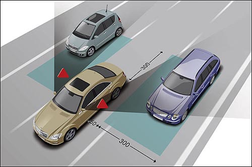 当邻近车辆进入视觉盲点区域时,Blind Spot Assist盲点辅助系统将以后视镜上的红色三角形警示灯提醒驾驶;当驾驶拨打方向灯欲变换车道时,Blind Spot Assist系统进一步闪烁警示灯并发出声响,以预防可能造成的车祸意外。 车辆左右两侧3米、后方3米的区块,极易形成车外后视镜上的视觉盲点。Mercedes-Benz便将六个短距雷达装置于车辆的前后保杆,以监测此一区块的邻近车辆动态。驾驶可藉由多功能方向盘和仪表板显示屏,开启Blind Spot Assist功能;待开启后,邻近车辆若进入视觉盲点区域,Blind Spot Assist系统便以车外后视镜的红色三角警示灯提醒驾驶人;若驾驶人拨打方向灯欲变换车道,Blind Spot Assist系统便会进一步发出声响,并闪烁警示灯以避免可能的车辆事故。 Blind Spot Assist系统初期将先提供S-Class和CL-Class两个车系,搭配DISTRONIC PLUS雷达测距系统、Brake Assist PLUS煞车辅助系统、PRE-SAFE主动安全防护系统和Parking Guidance停车导引系统等多种雷达辅助功能,构筑更为完整的主动式安全防护。目前这些主动式安全防护配备,在德国当地的报价介于2594.20至3391.50欧元之间不等。至于国内市场部份,总代理台湾戴姆勒克赖斯勒指出,Blind Spot Assist系统目前仍无导入的规划。