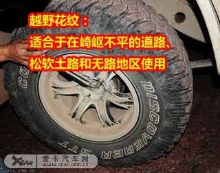 越野花纹的共同特点是花纹沟槽宽而深,花纹块接地面积比较小(约40%~60%)。在松软路面上行驶时,一部分土壤将被嵌入花纹沟槽之中,必须将嵌入花纹沟槽的这一部分土壤剪切之后,轮胎才有可能出现打滑。据测试:在泥泞路上,同一车型的车辆使用越野花纹的牵引力可达普通花纹的1.5倍。 越野花纹分为无向和有向花纹两种。有向花纹使用时具有方向性。越野花纹轮胎适合于在崎岖不平的道路、松软土路和无路地区使用。由于花纹块的接触压力大,滚动阻力大,故不适合在良好硬路面上长时间行驶。否则,将加重轮胎磨损,增加燃油消耗,汽车行驶振动也比较厉害。 混合花纹