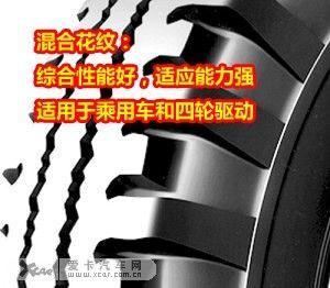 混合花纹是普通花纹和越野花纹之间的一种过渡性花纹。其特点是胎面中部具有方向各异或以纵向为主的窄花纹沟槽,而在两侧则以方向各异或以横向为主的宽花纹沟槽。这样的花纹搭配使混合花纹的综合性能好,适应能力强。它既适应于良好的硬路面,也适应于碎石路面、雪泥路面和松软路面,附着性能优于普通花纹,但耐磨性能稍逊。目前,一些货车和四轮驱动的乘用车多使用这种型式的花纹轮胎。 总结:轮胎花纹作为提高汽车性能,确保行驶安全的重要因素。因此,如何正确选购、安装和使用轮胎花纹就显得非常重要。车主一定要多个“心眼”才行。