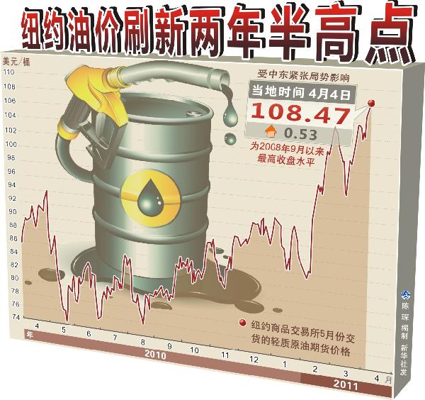 首先,近一段时间以来,受中东、北非特别是利比亚局势动荡影响,国际市场油价继续大幅攀升。3月初,美国西德克萨斯原油和英国北海布伦特原油期货价格分别达到每桶105美元和116美元,为2008年9月底以来的最高点,之后持续在每桶100美元和110美元以上的高位运行。多数机构预测,利比亚政局动荡对石油市场的影响短期内不会消除,加之日本灾后重建和替代核电对石油的需求可能明显增加,今后一段时间国际市场油价将继续呈现高位运行态势。