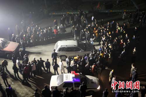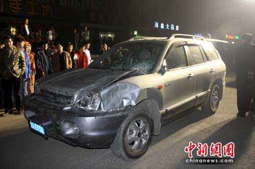 记者看到,吉普车驾驶员位置风挡玻璃破裂,保险杠脱落,掉在车前方五六米远,左侧车大灯被撞碎,机器盖翘起,驾驶员一侧后视镜都撞掉了。车前方有一大摊血迹。在吉普车后方约30米远,一辆两轮摩托车倒在地上,车旁还有一双鞋子。路人介绍,这个摩托车是最先被撞倒的,之后吉普车又向前冲,连续撞到几个人才停下。 从摩托车到肇事车停下的地方,一路上扔着好几只鞋,还有被撞者丢下的帽子。此时,多名交警正在现场勘查,四周聚集了数百名围观群众。