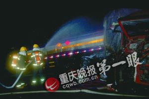 前晚10时16分,长寿区消防支队接到报警:在渝宜高速路往长寿方向云台至合兴路段上,一辆大型拖挂车追尾一辆大罐车,罐车被撞进边沟中,不明液体在泄漏!