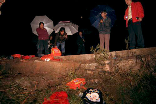 许多家长和群众在娄底市涟滨办事处澄清村校车翻车的事故现场清理遗落留下的书包