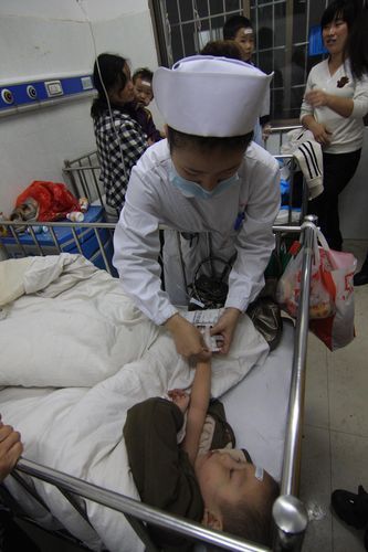 娄底市涟滨办事处澄清村翻掉的校车中受伤学生在接受治疗。