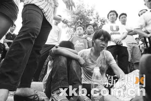 小辉的母亲和哥哥坐在事故现场痛哭。新快报记者王飞/摄