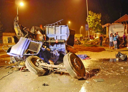 车祸之后的拉沙货车已面目全非,惨不忍睹。记者 姬生辉 摄 9日19时55分,兖州市颜店镇三棉厂附近一十字路口处发生悲惨一幕。两辆满载货物的大型货车在正常行驶中相撞,由于行驶速度都比较快,两车均发生侧翻。其中一车的驾驶室完全变形,前轮胎与车体脱离,驾驶员伤势严重死亡。 19时57分,兖州消防大队接到报警,该市颜店镇三绵厂附近一十字路口两货车相撞,一人被困变形的驾驶室中生死未卜。接警后,兖州消防大队立即出动1部抢险救援车、6名官兵火速赶赴现场。到达现场后,消防官兵发现,一辆装有沙子的大货车侧翻在路中央,车斗中的沙子散落一地。该车驾驶室已经严重变形,前两个轮胎完全与车体脱离,驾驶室内一人被困,身体多处受伤已深度昏迷。在该车北侧10米处,一辆满载钢管的大货车同样侧翻在路边,并且油箱在不停漏油,地上满是散落的钢材和汽车零部件。在钢材底下,消防队员还发现了一辆摩托车。 腿部受伤的摩托车司机瘫坐在地上,喘着粗气告诉消防队员,当时他驾驶摩托车自北向南行驶,在其身后自西向东行驶的一辆拉沙货车与自南向北行驶的一满载钢材的货车发生强烈撞击。 “听到声音后,我赶紧驾车往路边靠,但还是被散落的钢材砸到了,幸亏只受了点皮外伤。”其仍心有余悸。“发生事故时,两车的速度都很快,拉钢材的货车车尾部刮倒了拉沙车的驾驶室,相撞后两车都翻了。”一名目击群众表示。 消防队员了解到拉钢材货车侧翻后,司机迅速从驾驶室内爬出并无大碍,于是迅速对侧翻在陆中央的拉沙货车进行破拆,救援被死死卡在里面的驾驶员。由于车体侧翻加之驾驶室严重变形,破拆工作十分困难。消防队员立即与交警联系,调来一部吊车对侧翻的货车起吊后,迅速救出被困者。经过现场医护人员鉴定,该被困者由于伤势严重已经死亡。 目前,事故原因正在进一步调查中。 |