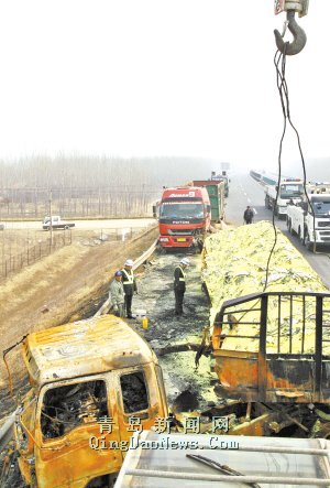 满载硫磺的解放车与一辆斯太尔车相撞引起大火 一名司机腿部骨折