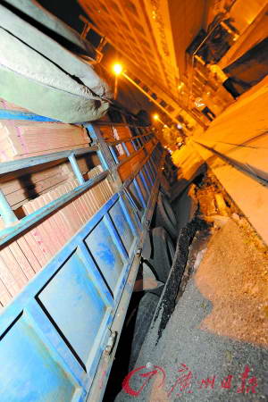 广州街头出现10平方米“天坑” 大货车轧入