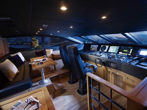 依靠这些复杂而精密的设计生产流程,Sunseeker才能如此自信地向世人宣称,他们的每艘游艇都拥有最卓越的品质。 至于游艇设计界普遍遭遇的成本与高性能无法权衡的难题,也在Sunseeker煞费苦心的钻研下得到了有效的解决。 置身位于飞桥甲板层的驾舱,眼前的宽阔视野是同尺寸游艇所无法比及的,不过要在这里观测到船尾的动向,恐怕就有些困难了,因为特别加长的飞桥甲板层挡住了船尾,这不禁让人担心起Predator 130离靠码头时的安全性。不过据Sunseeker公司的技术人员称,早在制定设计方案时,他们就考虑到了这个问题,因而为Predator 130配备了功率强大的推进器,即便在无法观测到船尾的情况下,游艇也可以毫无障碍地离靠码头。“邪恶百合”号在进行试航测试时的航速基本维系在25节上下,Sunseeker相信经过机械调试后,最终交付给船东的游艇,其航速至少能够再提升2节。
