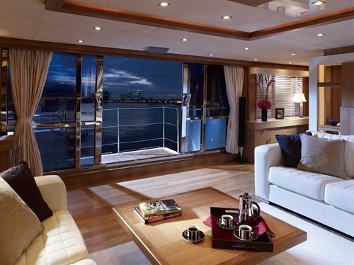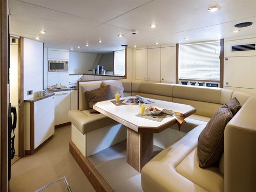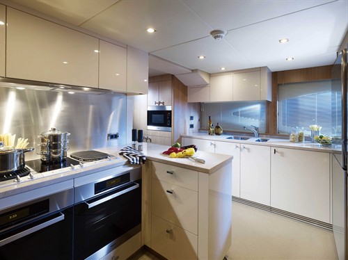 南安普敦的华丽现身 位于客厅正前方的餐厅,依靠一整排置物柜与客厅相互独立,如此一来便营造出私密而安静的用餐环境,而内外联动的客厅又可以将自然清新的氛围直接传递到餐厅内。 厨房与餐厅的位置一定不会相隔得太远,顺着餐厅继续向前就会发现位于左侧的厨房,正对面则是通往飞桥甲板层的楼梯。Predator 130的飞桥甲板层除了在净高上存在一些限制外,几乎涵盖了所有你能想到的水上休闲娱乐设施,那个如同巨型玻璃杯的日式按摩浴缸会是不少女士的第一选择。对于亚洲船东来说,能够在飞桥甲板层见到伸缩式遮阳顶篷,可能会大大激增他们的购买欲望。已经签下订单的那三位香港船东,想必正是冲着这点而来的。身处亚热带的香港水域,绝对少不了遮阳顶篷的庇护,但倘若成日委身在遮阳顶篷下,亲近阳光与水的自然闲情就会损失大半,唯有灵活自如的伸缩式遮阳顶篷才能完美满足这些略显挑剔的要求。