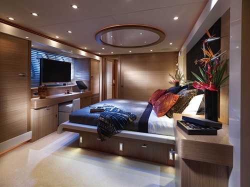 “邪恶百合”号的主舱同样位于主甲板层,房间的宽度横跨整艘游艇,与客厅一样,主舱内同样安设了依靠液压操控的阳台,为船东打造出一个专属的私人观景平台。如此富有新意的设计在南安普敦船展中得到了与会观摩者的一致垂青,为此Sunseeker公司正计划将该设计进一步推广,沿用到品牌旗下的其他船型中。 除主舱外,下甲板层另置有两间双人套房和两间标房,橡木材质依然是房间的主体,不过与明朗的客厅相比,Predator 130的船舱在色调上更为温婉,对比色的灵活运用令装潢风格显得更为丰润。据Sunseeker呈现的参考设计方案显示,其中的一间双人套房能够按照船东本人意愿进行改造,“邪恶百合”号的船东就将那个房间改装成了健身房。 船员舱与客舱一样位于下甲板层,四间船员舱总共可容纳七名工作人员,而船员日常生活所需的一切设施都集中在这片区域。 铁血战士以性能制胜 实现这一目标当然离不开完善的导航通信设备,”邪恶百合“号驾舱内的监视屏采用了触摸操控系统,不但有效提高了船员的工作效率,还大大减少了系统故障的发生率。与此同时,电力系统采用了液压操控,这令游艇的安全性得到了大幅提升。 更令人意外的是,在汽车制造业相当普遍的六西格玛质量管理系统也被Sunseeker公司引用到了游艇制造中。该系统能运用控制图对关键工序的波动原因进行控制,并对工艺参数进行有效的整改和修订,“邪恶百合”号上的每一扇舱门,每一个橱柜,其品质都已经进行了最优化的处理。