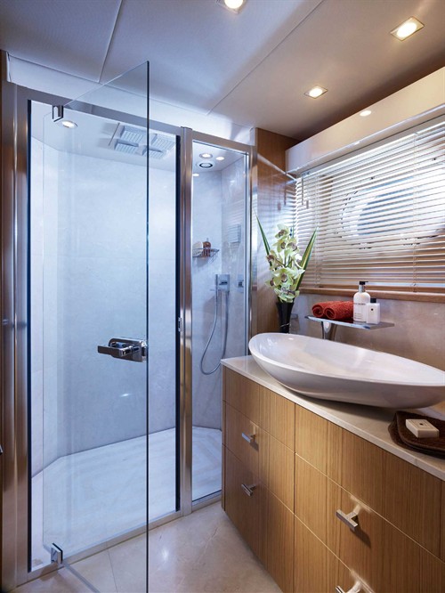 追求设计感的Predator 130,甚至将前卫时尚的情调带入到了主舱的盥洗室内, 深度剖析成功秘诀 此后设计方案才开始进入3D效果图的描画阶段,这期间需要所有部门的共同协作,从五金配件到室内布局,每个环节都需要提交设计图纸,这意味着在3D效果图呈现前,整艘游艇的具体配置和技术参数已经经过了精确的测算。 “邪恶百合”号作为Predator 130的第一艘成品,自然需要份外多的设计筹备,在投入实际生产前,技术人员已对船体外覆盖的胶衣、防腐漆、亮光度,横向隔板拼搭的纵桁,运用在干舷表面的轻木铝芯合成材料,以及甲板、上层结构中采用的PVC发泡材料等进行过全方位的统算。 更令人意外的是,在汽车制造业相当普遍的六西格玛质量管理系统也被Sunseeker公司引用到了游艇制造中。该系统能运用控制图对关键工序的波动原因进行控制,并对工艺参数进行有效的整改和修订,“邪恶百合”号上的每一扇舱门,每一个橱柜,其品质都已经进行了最优化的处理。