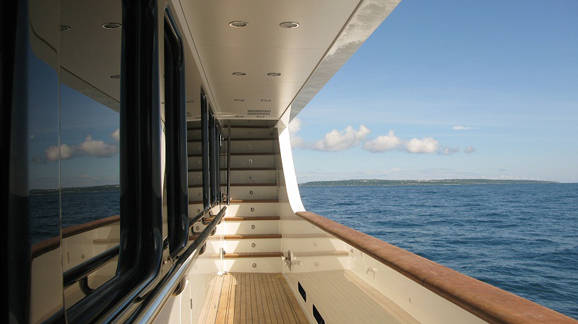船上还预留出广阔的露天空间以供乘客娱乐与休息。例如主甲板后面的露天餐厅和装备有硬顶的太阳甲板,该甲板也同样配备了酒吧和太阳浴设备。更具特色的无疑是放置在太阳甲板后面的高尔夫球座,由此可见游艇设计者的细心周到。
