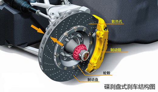 由于碟式制动可以提示车辆在高速行驶时刹车的稳定性,碟式制动已成为当前刹车系统的主流。碟式制动也叫盘式刹车,分为普通盘式刹车和通风盘式刹车两种。由于碟式制动的刹车盘暴露在空气中,使得盘式刹车有着很好的散热性,在高速急刹车或在短时间内频繁刹车,刹车的性能较不易衰退,可获得较佳的刹车效果,增进车辆的安全性。 而通风盘式刹车是在盘面上钻出许多圆形通风孔,或是在盘的端面上割出通风槽或预制出矩形的通风孔。为的就是利用风流作用,其冷却效果要比普通盘式刹车更好。