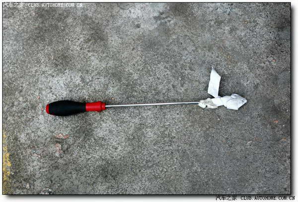 我的主要工具就是一把长锣丝起子,只有这东西韧性好一些,当然,如果有全套的凹陷修复工具,或者说我有条件,根据车身结构,临时焊接一些工具,效果最好。