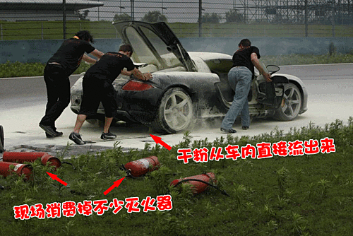 现场可以看到,黑色车身已经被干粉铺了一层,可见当时的火势非常的猛烈。干粉直接从车内流了出来,可惜一辆价值百万的豪车瞬间毁灭,实在太烧钱。