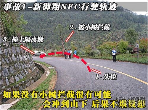 新御翔碰撞事故是一前一后相继发生的。由于下了一个上午的雨地面十分湿滑,专业车手在在驾驶时速度过快入左弯时结果转向不足,向路边直冲过去撞到了隔离墩。幸好路边有棵小树拦截,不然的话御翔将直冲山下后果不堪设想。