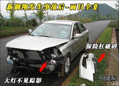 虽然车辆发生事故时车速较快,但由于现碰到路边的小树和泥土的缓冲使得车速大大的下降,以至于新御翔没有受到带大的伤害,发动舱基本没有变形,正副驾驶气囊也没有弹出。