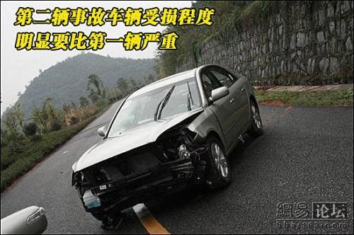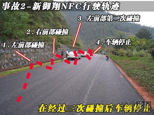 第二起车辆事故可以说是由第一起事故引起的。在前车发生事故后,后方车辆在转弯时看到前车迅速刹车停下,在停满了3-4辆后。最后一辆新御翔在不知到前方道路的情况下快速驶到,转弯看到一群车停在路旁,避让不及,急打左方向,结果车辆失控撞到山体。当时车速至少在100Km/h以上。