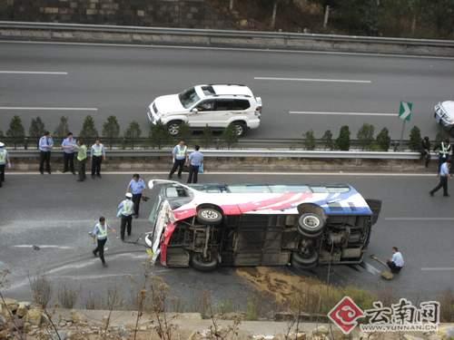 18日下午1点45分,安楚高速公路昆明至楚雄方向K128+500米处(孔家庄隧道出去1公里)发生一起重大交通事故,一辆从下关开往昆明载有29人的中型客车发生侧翻,当场死亡1人,28人受伤,其中重伤1人。事故发生后,交警部门对楚雄至昆明方向的高速路实施了封闭,记者去现场只能从320国道绕行至山上的小路,站在在距离事故现场约30米的山坡上,记者看到在开往昆明方向的高速路上,一辆客车侧翻在路中间,虽是开往昆明方向,但车头却调转了朝着相反方向。凹陷的车头上,挡风玻璃像蜘蛛网一样满是裂痕,右侧有个很大的窟窿,车身旁边一道长长的划痕非常明显,车身下漏了一大滩汽油,一块标有大理两个字的白色牌子飞到了距离客车有5、60米的地方。这时交警部门正在做现场勘查,在汽油上散上了沙子。 “嘭”,我当时听到一声巨响,跑出来一看,就看见一辆客车翻在坡底的高速路上,有个人被甩出了车外躺在地上一动不动,其他的乘客在车上哭的哭,喊的喊。”高速路旁的楚雄大瓦房村的一位村民目睹了车祸时的情景。附近一位路过的驾驶员猜测说,从挡墙在撞击的痕迹上看,客车可能是撞上可挡墙后,又反弹回来,驾驶员急忙打方向盘,车子就来了个360度大转身后翻倒在地。“这段路过了隧道后,因为是下坡路段,不少大车司机踩刹车时会不停地淋水,所以路面比较滑,司机车速稍一快就容易出事。”