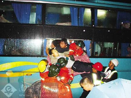 大客车头部严重受损。吴远栋 摄 5月25日晚10时左右,在桂梧高速公路阳朔往平乐方向道其龙隧道口发生四车追尾事故,两辆长途大客车与一辆大货车及一辆小货车撞在一起,造成42人不同程度受伤。事故发生后,阳朔、平乐两县的消防、交警和医院等多个部门联合行动,第一时间赶到现场救援。 5月26日上午,记者在阳朔县人民医院了解到,被送往该院的伤者共33人(3人是外国游客),其中有9人受重伤。 此外,还有9名伤者在平乐县人民医院接受救治。 小货车司机潘先生向记者讲述了事故发生的经过。当晚,他驾车通过道其龙隧道时,突然发现出口处有一辆重型大货车横在路中,一车轮跌落排水沟,司机正在一旁打电话。他立即刹车,将车停下。他正想下车察看,后面一辆大客车快速冲来,重重撞在他的车上,推着他的车撞上了前面的大货车。他的车受损严重,车上5人受伤。他因受伤较轻,就下车抢救伤者。就在这时,后面又有一辆大客车快速开来。他见势不妙,立即架着两名伤者躲开。在这一瞬间,那辆大客车司机显然不知道前面发生车祸,加速超过一辆车后,重重撞上前面的大客车尾部,导致两辆大客车上众多乘客受伤。 一名受了轻伤的男子告诉记者,他是那辆贵州开往福建的大客车上的乘客。当晚10时左右,乘客们大多睡着了。突然间,车后传来“嘭”的一声巨响,乘客们被震出铺位,滚落到走道上。不少乘客血流满面,车厢满是哭喊声。大客车停下后,他从车窗爬出来,才明白刚刚发生了四车追尾事故。 “车祸发生得太突然了,我还没反应过来,就被震得从铺位上跌落下来。”一名搭乘桂林开往深圳大客车的女乘客说,事发后,她因小腿骨折,躺在车厢的走道上动弹不得。她看到大客车的车头已面目全非,司机趴在方向盘上一动不动,白色衬衫被血染红了。被变形的座位卡住身体的乘客们发出痛苦的呻吟,车厢内一片混乱。 事故现场距离平乐县城很近,所以不仅阳朔县的消防、交警、卫生等部门人员出动,平乐县的有关部门人员也迅速赶到现场救援。26日零时许,被困车内的伤者被一一救出,交警和路政部门立即清理现场,疏导交通。 阳朔县人民医院急诊科负责人告诉记者,医院派遣6辆救护车赶到现场后,发现忙不过来,又通知乡镇卫生院出动了两辆救护车。此外,平乐县人民医院也派出多辆救护车。当晚,阳朔县人民医院80多名医护人员彻夜加班,紧急救治伤员。 “阳朔、平乐两个消防中队共出动了19名消防官兵。”阳朔消防中队副指导员吴远栋说,阳朔消防中队当晚10时28分赶到隧道口,只见两辆载满乘客的双层大客车、一辆大货车、一辆小货车撞成一团,车辆损毁严重。一些伤者已从车内自行爬出,两辆大客车内共困着20多名司乘人员。消防员立即用救援设备对车体进行破拆,以解救被困者。据了解,26日上午,阳朔县委、县政府有关领导来到医院看望伤者,并要求医院全力救治伤者。 交警初步调查得知,事故是因下雨路滑、行车视线不良引起的。目前,事故的具体原因调查及善后工作仍在进行中。 |